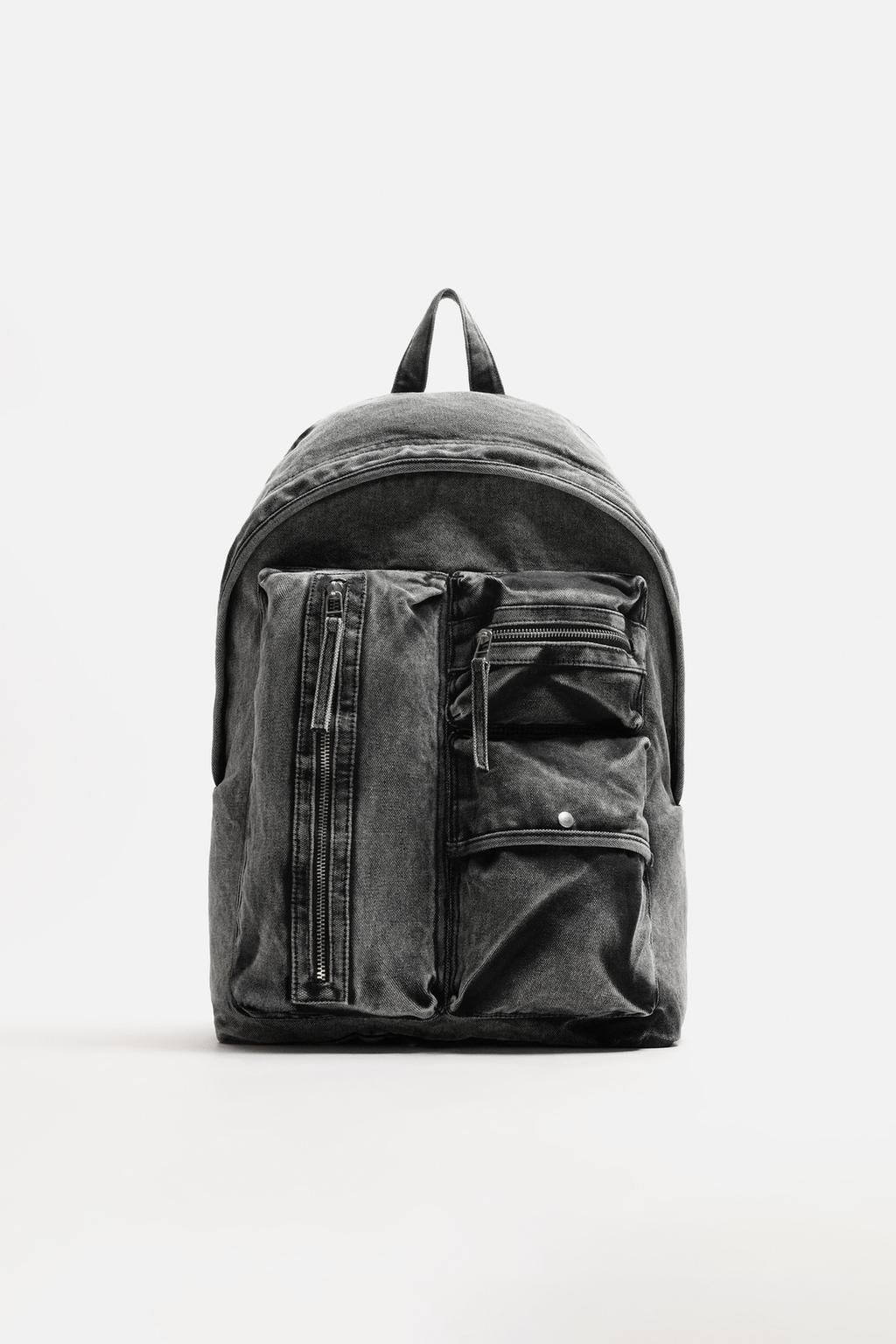 Backpack made from washed-effect cotton denim fabric. Main compartment with zip closure. Inside, there is a pocket with zip closure. On the front, there are three pockets, two with zip closure and one with snap-button fastening. Handle and two adjustable shoulder straps.